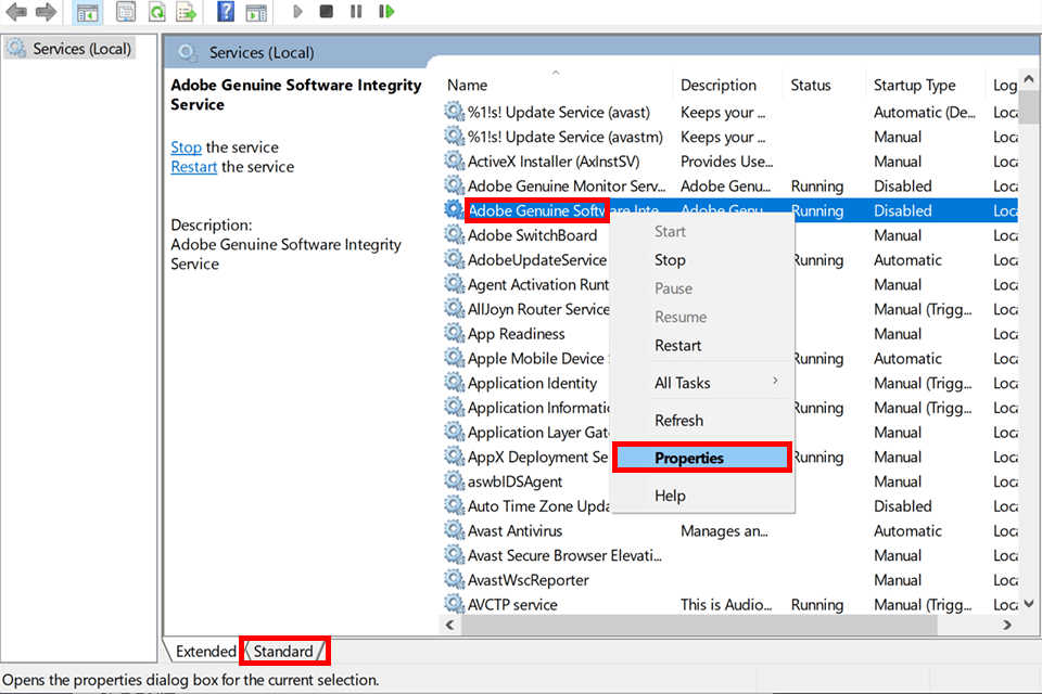 In the alphabetical list, find “Adobe genuine software integrity service”. Right-click on this service to open the context menu, pick the “Properties” option from the list.