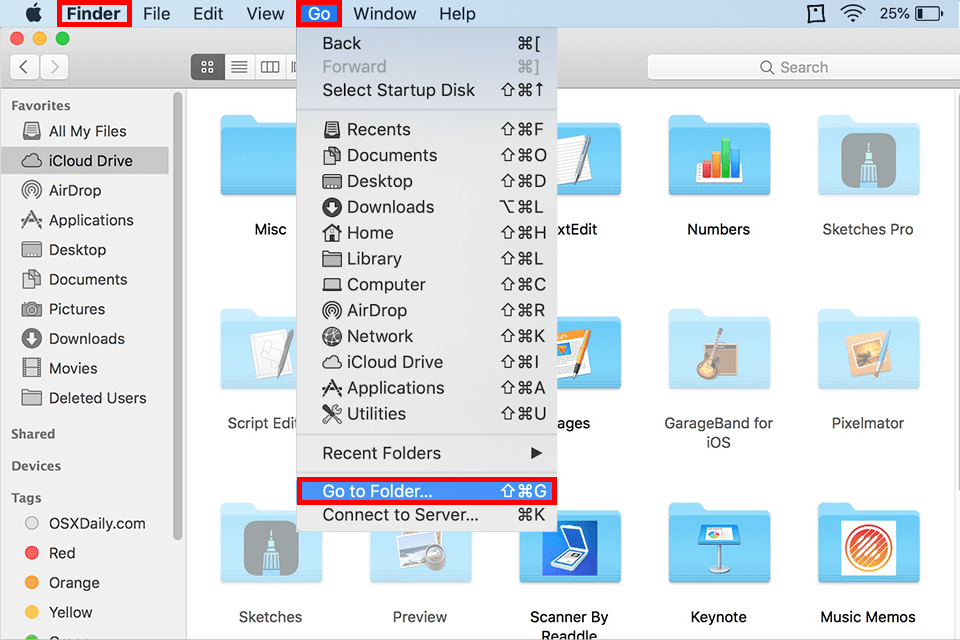 In the top navigation bar, you will see the “Go” option. Pick it and click the “Go to Folder” option.