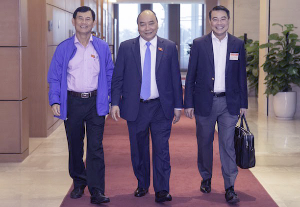 Từ trái qua: Ông Nguyễn Ngọc Phương, Phó trưởng đoàn đại biểu Quốc hội tỉnh Quảng Bình, Thủ tướng Nguyễn Xuân Phúc, Thống đốc Ngân hàng Nhà nước Lê Minh Hưng bên hành lang Quốc hội ngày 1/11. Ảnh: Hoàng Phong.