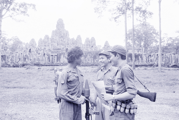 Quân tình nguyện Việt Nam tiếp tục ở lại Campuchia để hỗ trợ chính quyền mới chiến đấu chống tàn quân Khmer Đỏ. Lính Campuchia (trái) và hai chiến sĩ quân tình nguyện Việt Nam bên ngoài đền Angkor Wat năm 1982.