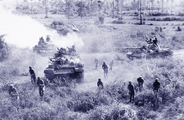 Các chiến sĩ xe tăng Việt Nam vẫy tay chào người dân Campuchia đứng hai bên đường trước khi rút quân về nước năm 1989.